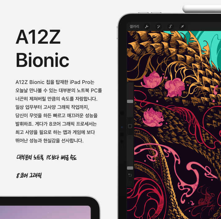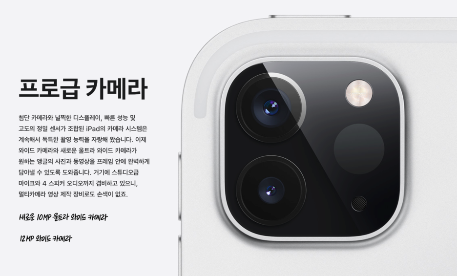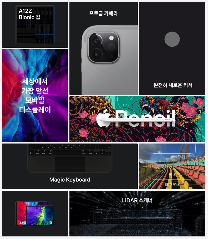 새로운 프로세서 A12Z 바이오닉 칩! 기존의 A12 바이오닉과 동일한 프로세서는 아닙니다. 더욱 발전된 모델이고 우려먹기는 아니네요.아이폰 11 프로와 같이 카메라 아일랜드(인덕션)이 포함이 되었고, 와이드, 울트라 와이드 카메라 2종과 Depth 카메라인 LiDAR스캐너가 들어갔습니다. 증강현실에 조금더 힘을 주고 있는 애플입니다. 뒤에 이어 소개할 트랙패드가 포함된 매직키보드가 출시함에 따라 iPadOS 전용 커서가 새로 생겼습니다. 기존 PC의 마우스 커서와 어떻게 다른 사용성을 가질지 기대가 됩니다.