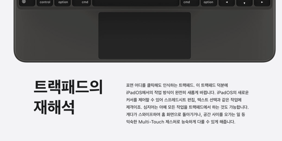 기존의 매직 키보드에는 트랙패드가 없었습니다. iPadOS에서 커서를 지원하지 않았기 때문입니다. 터치와, 키 입력만으로 사용을 해야 했습니다.