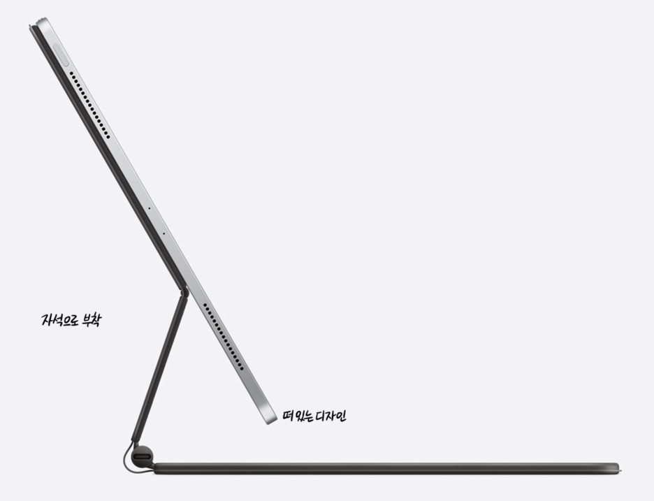 기존과 같이 자석으로 부착되지만, 아이맥과 같이 공중에 뜬 디자인으로 만들어졌습니다. 아이패드에서도 아이맥의 향기를 느낄 수 있군요.