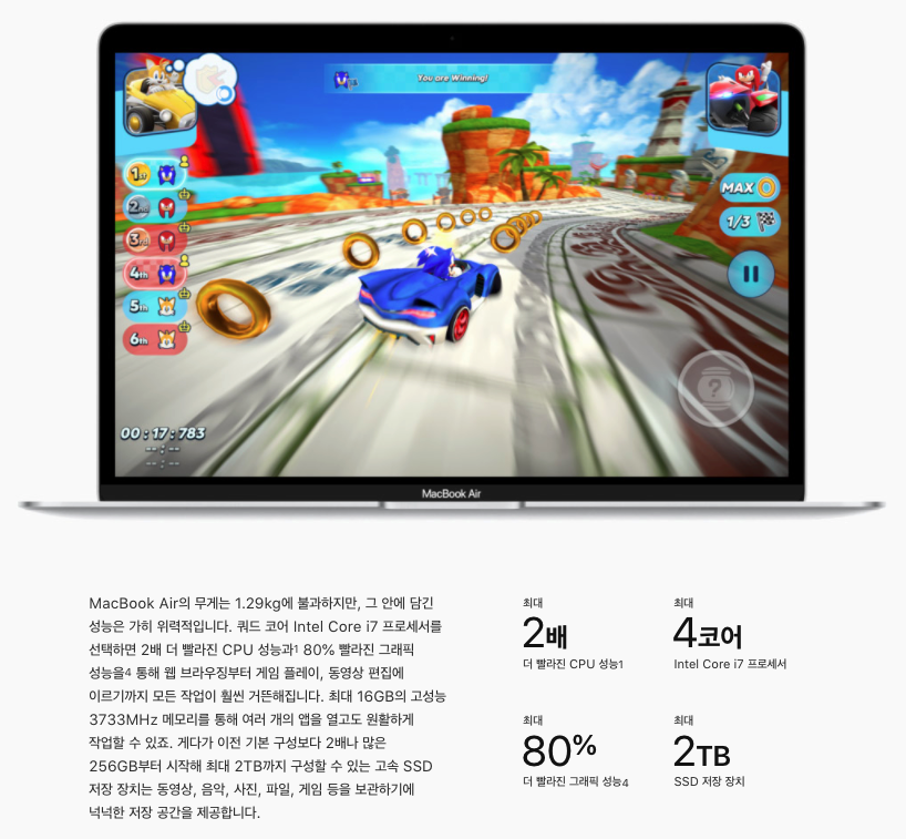 맥북에어에도 인텔 10세대 프로세서가 탑재 되었습니다. i7 쿼드코어까지 선택이 가능한 맥북에어는 맥북과는 조금 다른 노선을 걷고 있습니다.