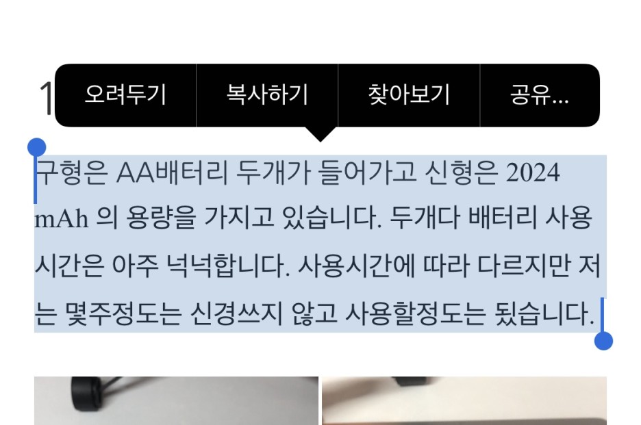 아이폰으로 텍스트 선택을 위해서 텍스트를 꾸욱 누르고 있다보면 해당 단어가 선택이 되면서 앞뒤로 드래그핀이 생성되어 범위설정을 할 수 있죠. 그렇게 선택하고나면 복사할수 있는 버튼이 뜨게 됩니다.