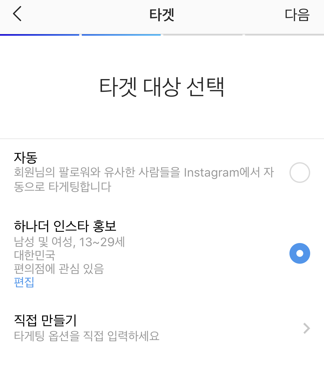 목표 행동을 선택하면, 홍보를 할 타겟을 선택하게 된다, 자동으로 내 팔로워들과 유사한 타겟들로 선택할 수도 있고, 좀더 세부적으로 원하는 타겟을 직접 선택할 수 있다, 미리 타겟을 지정해두고 불러와 사용할 수 도 있다.
