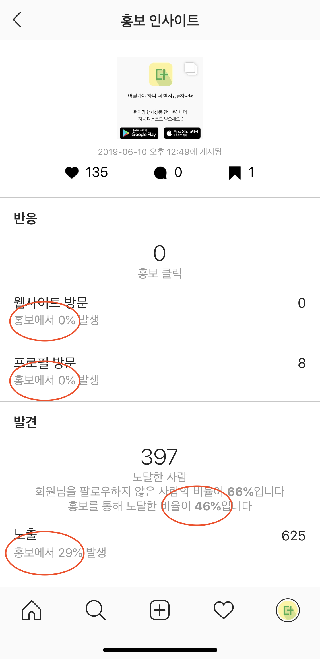 총 9,435원을 홍보비로 사용을 했네요. 클릭률( 프로필 도달 ) 0회이므로.. 계산 불가 @_@